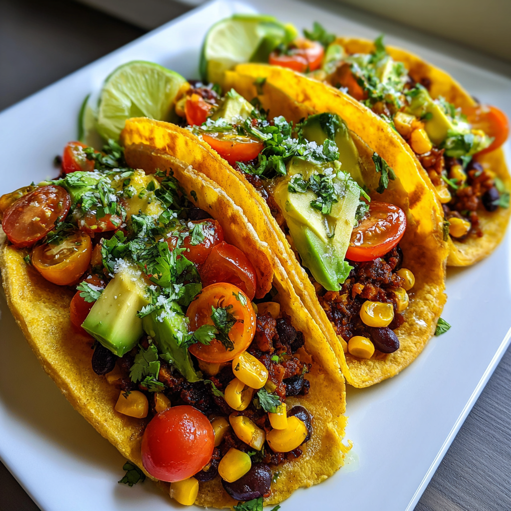 These tacos are filled with spiced lentils, topped with fresh cilantro, diced onions, and avocado. Serve with lime wedges for a zesty kick!