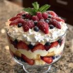 Not only is this trifle visually appealing, but it also boasts numerous health benefits. The main ingredients in this recipe, especially the berries, are packed with essential nutrients. Berries are rich in Vitamin C, which helps boost your immune system, and they contain antioxidants that protect your cells from damage. Additionally, the fiber in berries aids digestion and promotes gut health. The heavy cream adds a source of calcium, which is vital for bone health, while the vanilla pudding provides a creamy texture that enhances the overall experience.