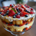 A delightful berry trifle layered with creamy custard, fresh berries, and sponge cake, perfect for any celebration.