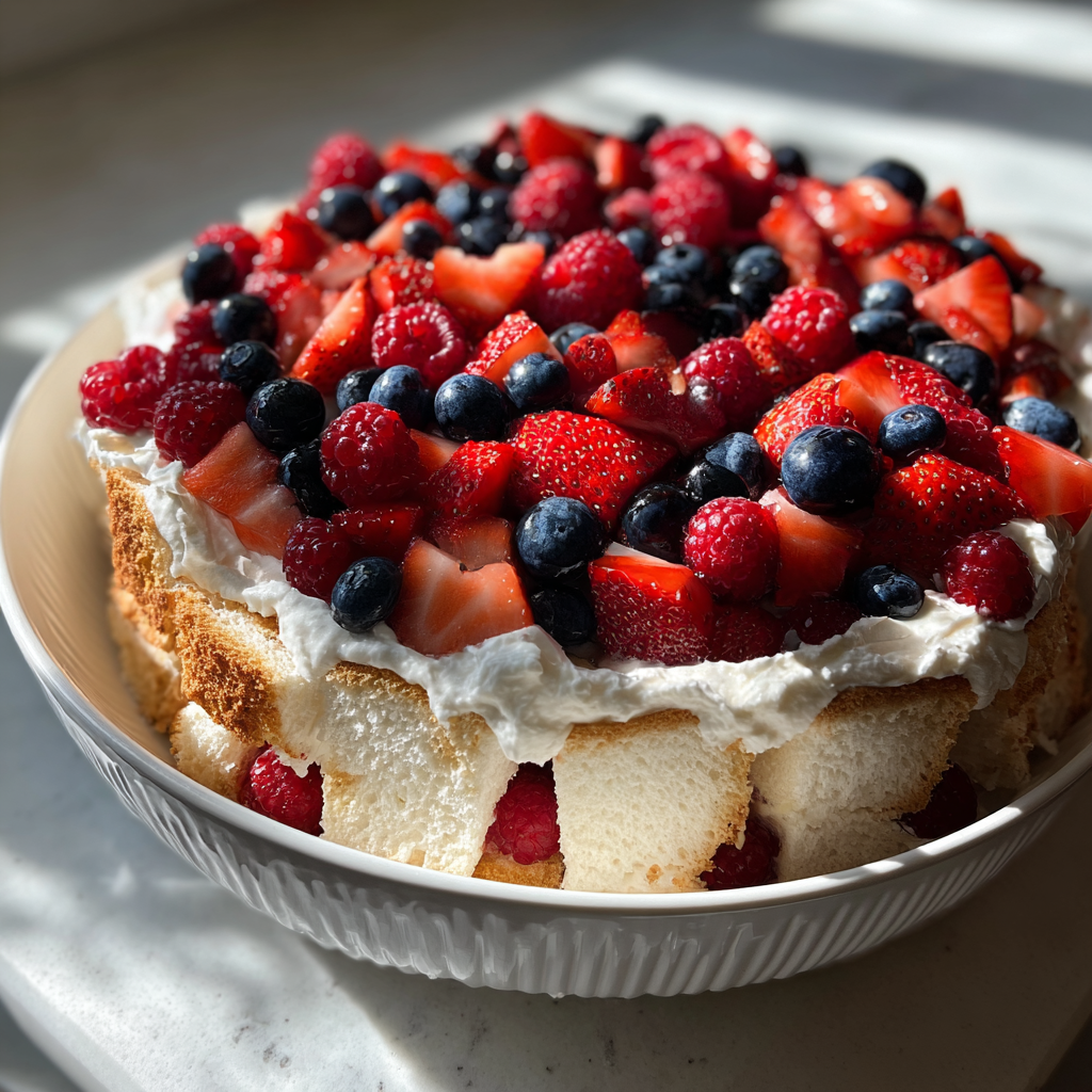 Imagine a light and fluffy angel food cake, cradling layers of juicy, vibrant berries, all enveloped in a cloud of creamy whipped topping. As you take a bite, the sweetness of the strawberries, blueberries, and raspberries mingles perfectly with the airy cake and the rich cream. The colors of the berries pop against the white of the cream and cake, creating a visually stunning dessert that is as appealing to the eyes as it is to the taste buds. The aroma of fresh berries mixed with the scent of vanilla wafts through the air, inviting everyone to dig in.