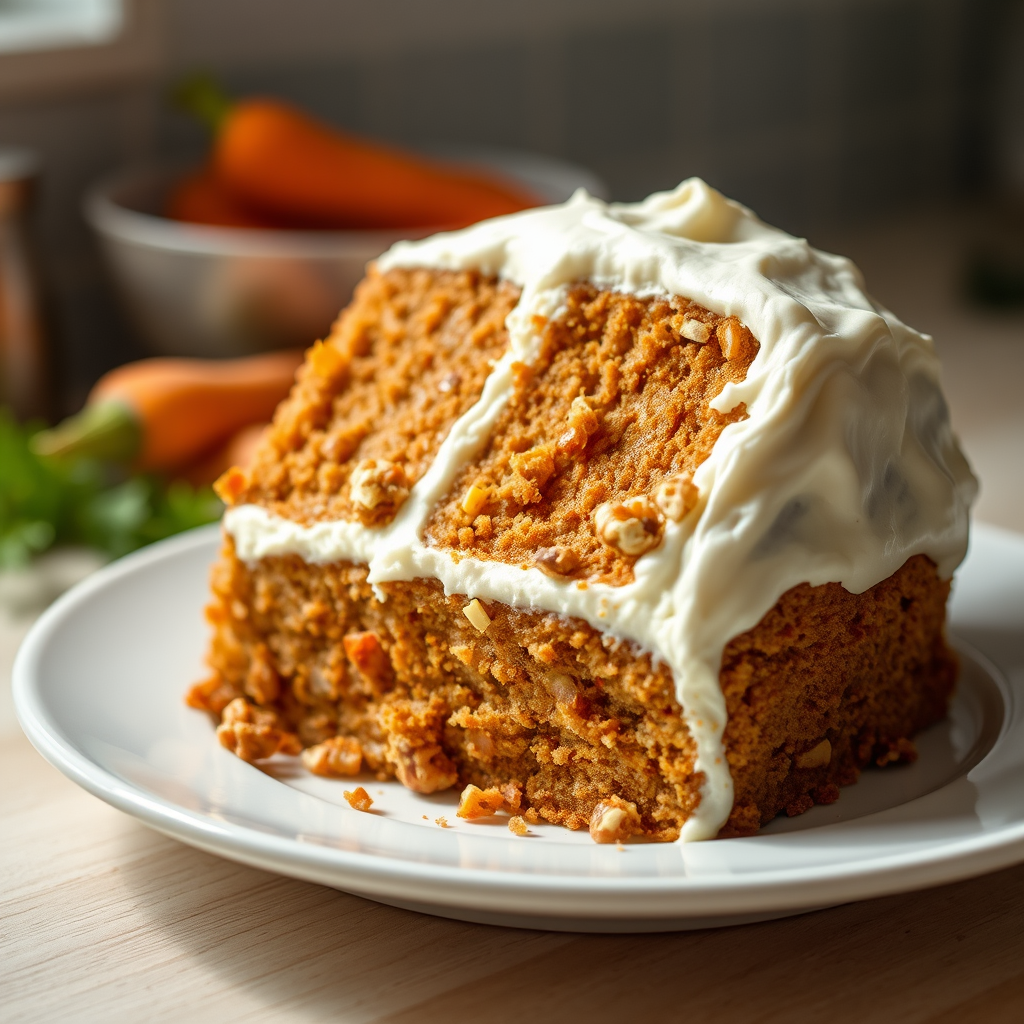 Carrots, the star ingredient in this recipe, offer a wonderful blend of sweetness and earthiness, complemented by aromatic spices like cinnamon and nutmeg. The cream cheese frosting adds a creamy texture that perfectly balances the cake’s moisture. As you slice into the cake, you can see the flecks of grated carrot and walnuts, a visual treat that is as appealing as it is delicious. Every bite is an explosion of flavor that reminds you of cozy family gatherings and festive celebrations.