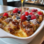 The overnight French toast casserole is a baked dish made from cubes of bread soaked in a mixture of eggs, milk, and spices, then baked until golden brown. It’s a convenient way to enjoy French toast without the need to cook each piece individually. This dish is often topped with syrup, powdered sugar, or fresh fruit, making it a versatile option for breakfast or brunch.