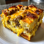 Keywords: overnight sausage egg casserole, breakfast casserole, easy breakfast recipe, make-ahead breakfast, sausage and egg casserole