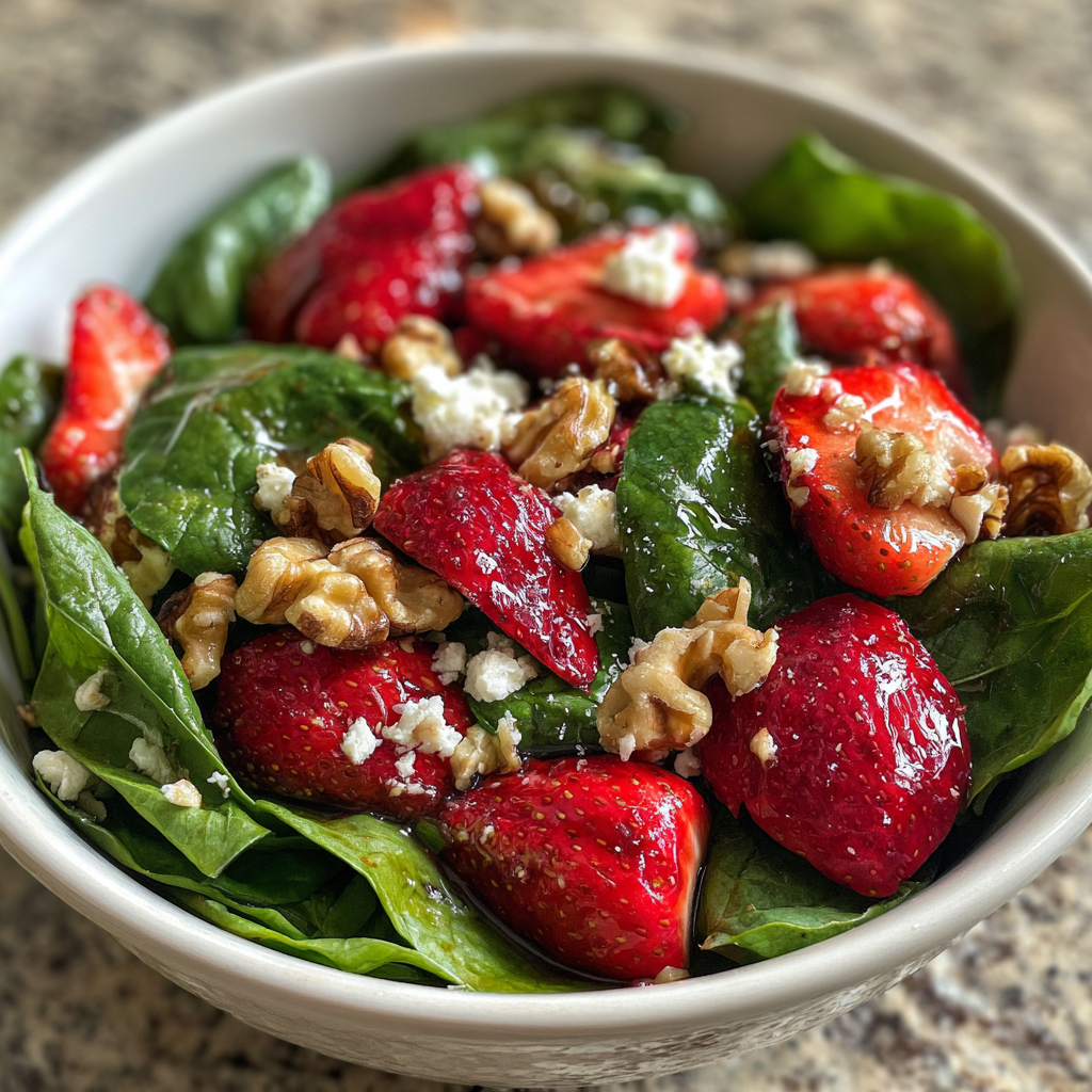 Combining spinach and strawberries creates a salad that is not only tasty but also provides a wealth of health benefits. The addition of feta cheese adds a creamy texture and a dose of calcium, while walnuts provide heart-healthy fats, making this salad well-rounded. The balsamic vinaigrette dressing adds a tangy flavor that complements the sweetness of the strawberries perfectly.
