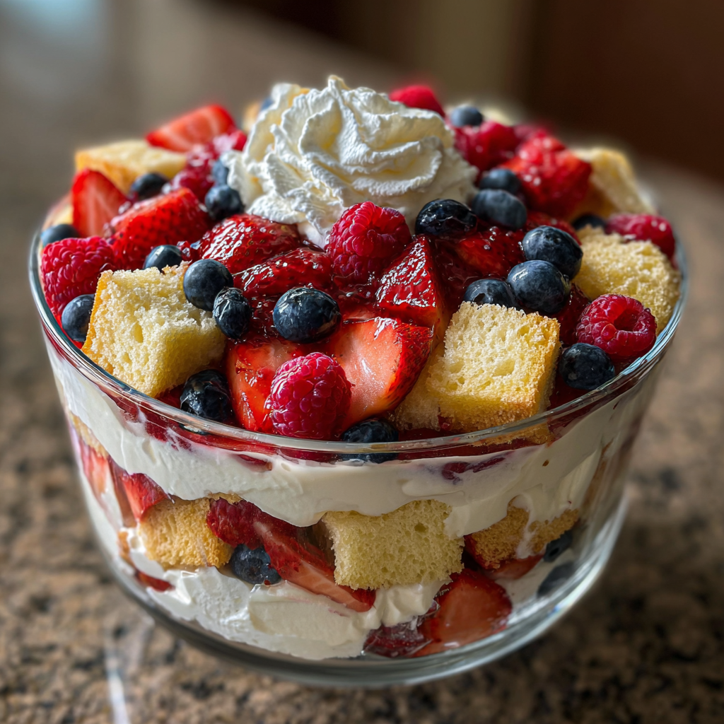 The aroma of fresh berries wafting through the air is enough to make anyone feel nostalgic for summer picnics and family gatherings. The vibrant colors of strawberries, blueberries, and raspberries contrast beautifully with the luscious white cream and the soft sponge cake. You’ll enjoy the creamy texture of the whipped cream, the pillowy softness of the sponge cake, and the juicy burst of berries, all coming together in one delightful dessert. What’s more, the visual appeal of this trifle can turn any simple gathering into a festive occasion.